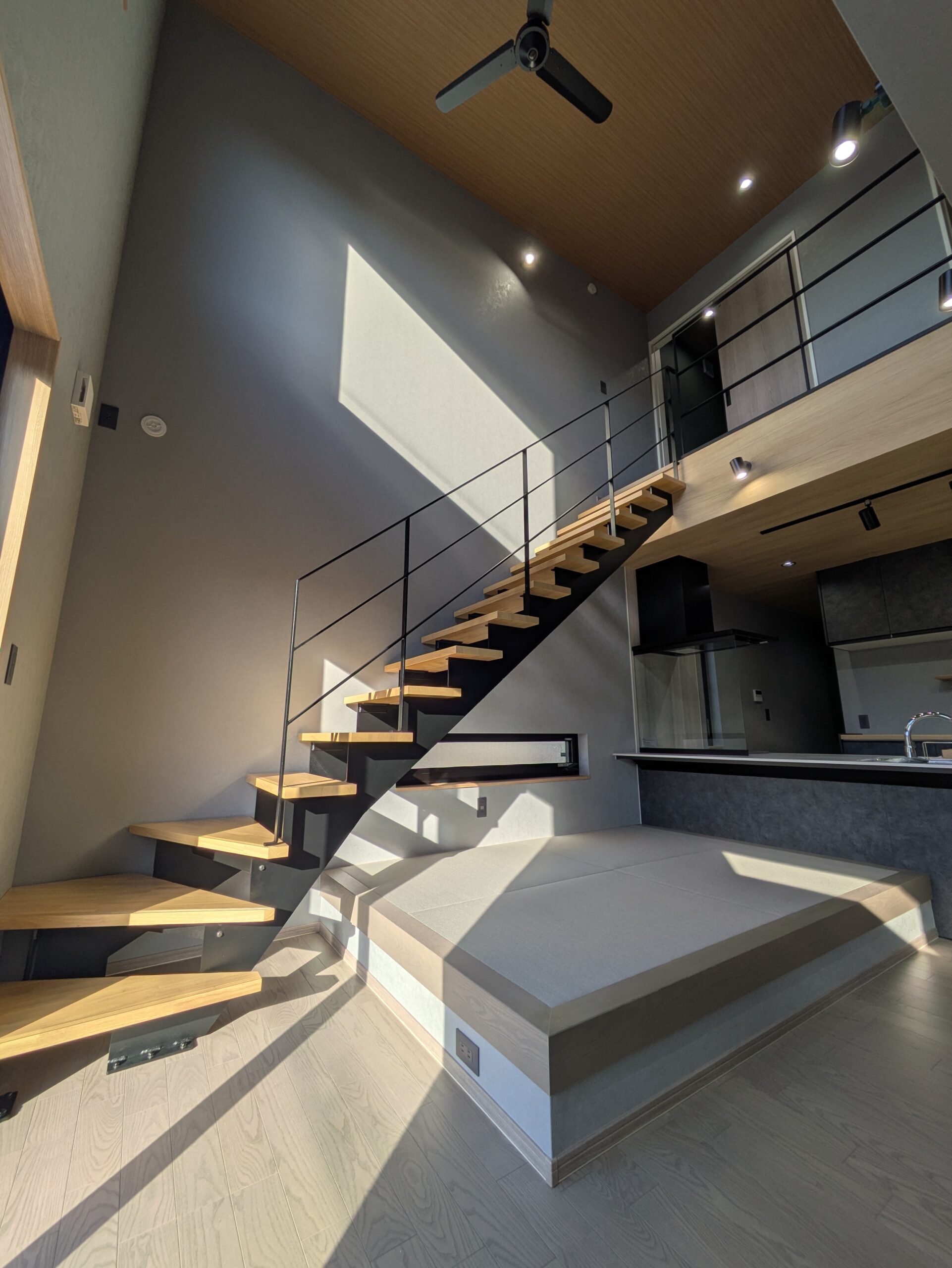 高知市西秦泉 吹き抜け×アイアン階段のある家 小上がり畳&横並びダイニングの暮らし